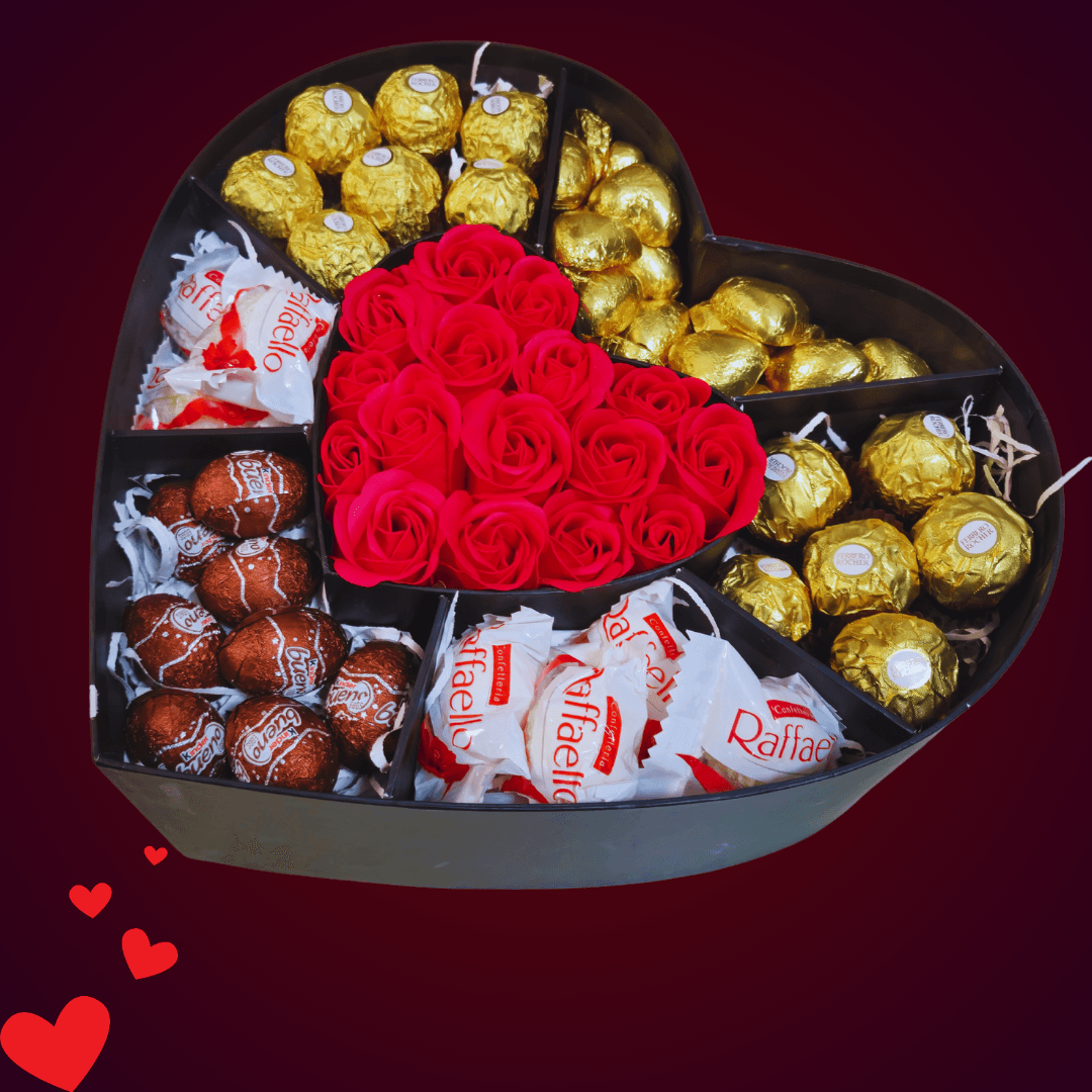 מארז "ורד" - מארז קינדר ענק בצורת לב עם פרחים | שוקולטי