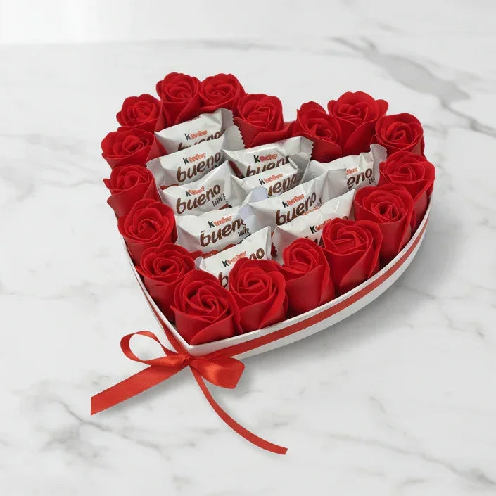 המתנה האולטימטיבית המשלבת את שני הדברים שכולם אוהבים: רומנטיקה ופינוק מתוק! מגש לב אלגנטי ודק, המעוטר בשילוב צבעי ורדים קלאסי (אדום ולבן) במעטפת, ושוקולדי Kinder Bueno בלב המגש. זוהי מתנת האהבה, יום ההולדת או יום הנישואין המושלמת, המבטיחה גם ריח נעים וגם חיוך מתוק.