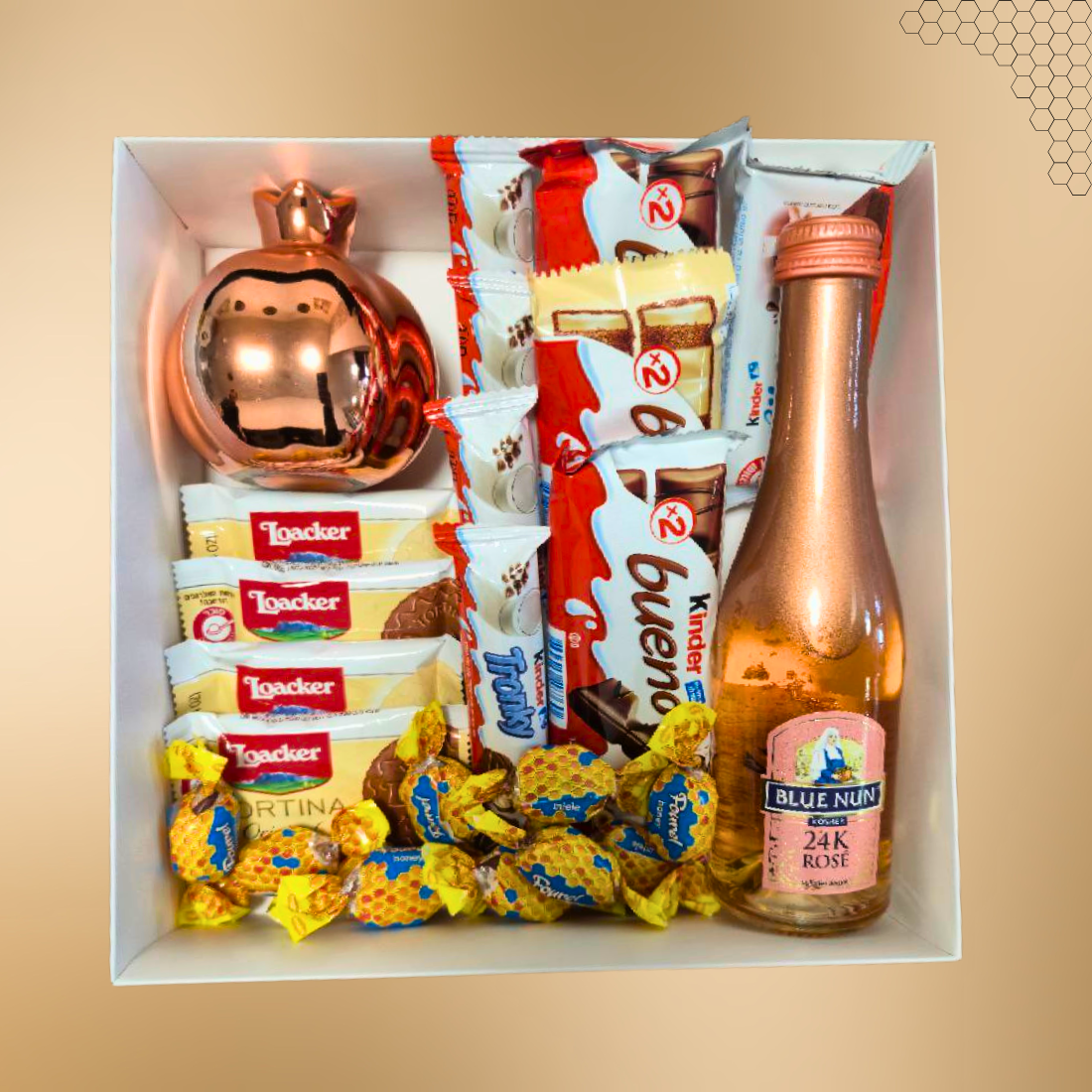 • רימון רוז-גולד דקורטיבי: הכוכב של המארז! לא רק סמל של שפע וברכה לחג, אלא פריט עיצובי מרהיב בגימור מטאלי, שיישאר כמזכרת אלגנטית על שולחן החג.